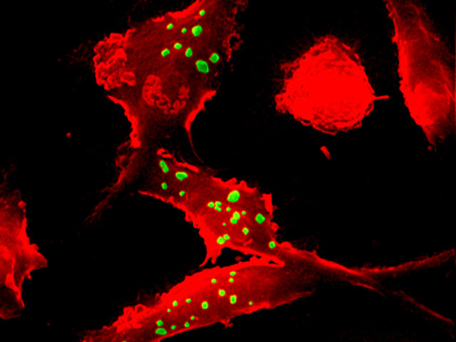 «Acanthamoeba polyphaga» mimivirus (en vert) pénètre dans certaines cellules du sang – les macrophages (en rouge) – par phagocytose, pour ensuite s’y multiplier. Cette nouvelle stratégie d’entrée d’un virus dans sa cellule cible, habituellement utilisée par les bactéries et les parasites, vient d’être découverte par des chercheurs du CNRS. Identifié pour la première fois en 2003, mimivirus est le plus grand virus connu à ce jour (700 nanomètres) et peut causer des pneumonies chez l’homme. Cette découverte permettrait de mettre au point de nouvelles approches thérapeutiques contre les pneumonies résistantes aux traitements actuels.