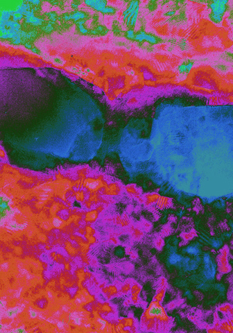 Pour mieux comprendre les tissus biologiques minéralisés humains, comme les os, les chercheurs de l'Institut des sciences de la Terre d’Orléans ont étudié le processus de construction de la nacre en escalier. Prélevée chez une huître géante – prise ici en microscopie électronique en transmission (fausses couleurs) –, les plaquettes minérales de la nacre assemblées avec des cristaux organiques (en rouge) forment une première marche ; un ciment (en bleu) fait alors la connexion avec la marche supérieure. Ce pont organique, visible au centre du cliché entre les deux masses bleues, qui relie les deux structures, permet la transmission du modèle à suivre… reproduisant les motifs exactement à l’identique.