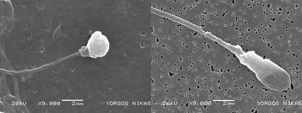Une équipe de chercheurs du CNRS* vient d’identifier le gène DPY19L2 comme le responsable de l’un des syndromes de l’infertilité masculine, la globozoocéphalie spermatique. Ce syndrome est caractérisé par la production de spermatozoïdes à tête ronde (photo de gauche) différents des spermatozoïdes normaux (photo de droite). Les spermatozoïdes porteurs de cette anomalie sont inféconds car ils ne peuvent pas percer la membrane pellucide de l’ovocyte.