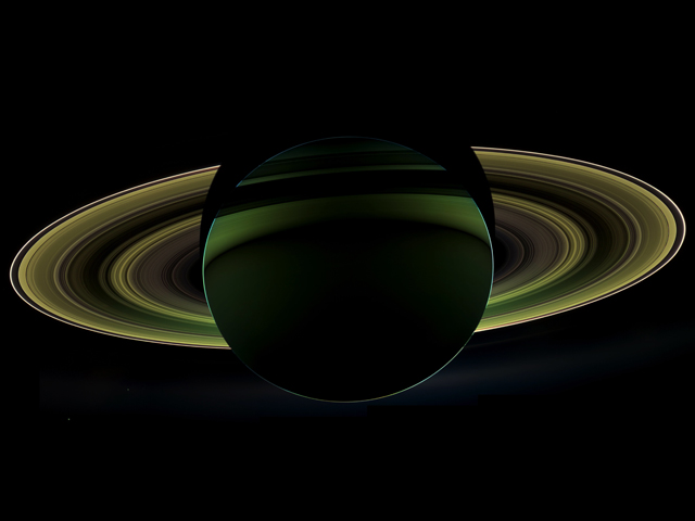 La sonde Cassini vient d’envoyer cette photo superbe, prise à contre-jour le 17 octobre 2012, à une distance de 800 000 km, alors que le Soleil se trouvait dans la direction opposée par rapport à Saturne. Nous observons donc la lumière réfléchie par les anneaux de cette planète. Encelade et Téthys, deux satellites de Saturne, sont également visibles en bas et à gauche. Cette image a été prise en infrarouge, ses teintes ne sont donc pas celles qu’observerait un œil humain.