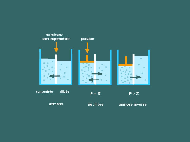 L'osmose est un phénomène naturel. L'eau circule à travers une membrane semi-perméable afin que les concentrations soient à l'équilibre de part et d'autre de la membrane. L'osmose inverse oblige l'eau à circuler à contresens.