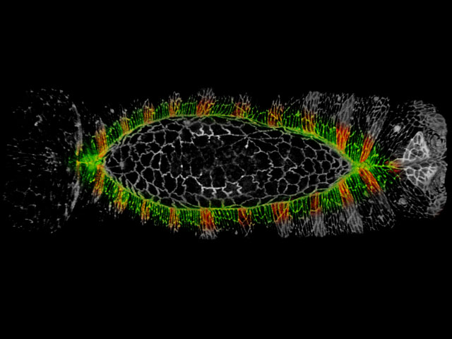 Au cours du développement embryonnaire de la mouche drosophile, certaines cellules sont capables de changer d’identité puis de compartiment. Ce mécanisme de plasticité cellulaire, contrôlé génétiquement, confère aux tissus la capacité de s’adapter lors de leur soudure. Cette découverte, faite par une équipe de chercheurs du CNRS et de l’université de Nice, pourrait permettre de mieux comprendre le phénomène de cicatrisation. La photo représente un embryon de drosophile en cours de fermeture dorsale. La région en couleur est la zone de soudure de l’épiderme. Les cellules caméléon se trouvent à la jonction de deux compartiments, celui d’origine (en vert) et celui de destination (en rouge). Source : CNRS, 8 juin 2010