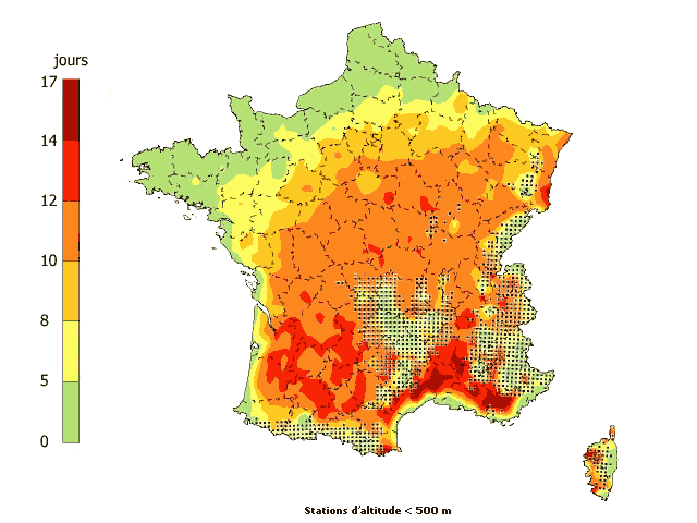 (Nombre de jours avec température maximale >= 35°C pour la période du 01/08/2003 au 18/08/2003)