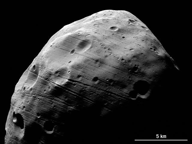 Entre le 12 juillet et le 3 août 2008, la sonde européenne Mars Express procède à une série de survols de Phobos, l'un des deux satellites martiens, réalisant des images stéréoscopiques d'une résolution encore jamais égalée. Sur cette photo, prise le 23 juillet lors d'un survol à moins de 97 km, les détails les plus fins ne mesurent que 3,7 mètres.