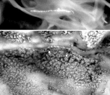 Qu’est-ce qui différencie ces deux chaînes de cristaux ? Rien, sinon que la première (en haut) a été créée sur Terre et la seconde (entre les deux flèches) sur Mars. Par des bactéries ? C’est toute la question.