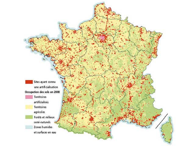 Selon la dernière étude de l’Institut français de l’environnement, présentée le 13 avril 2005, 4,8% du territoire français étaient urbanisés en 2000, contre 4,6% en 1990. Les espaces les plus atteints par cette expansion urbaine sont les prairies (-0,8%) et les zones agricoles (-0,7%). En revanche, les forêts, qui couvrent 26% de la superficie de la France, continuent de gagner un peu de terrain (+0,1%). Sur cette carte, les points rouges représentent les zones qui se sont “artificialisées“ depuis 1990 (bâtis, routes et infrastructures).