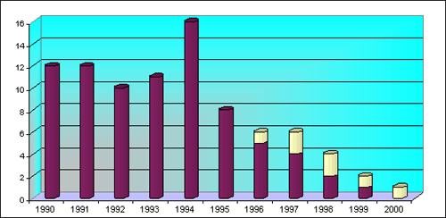 Nombre de cas par annnée. Les chats représentés par la couleur claire sont nés après 1990, date à laquelle le retrait des matières à risques a été étendu aux aliments pour animaux.