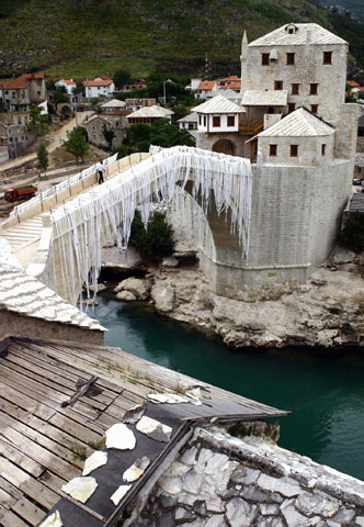Dernières finitions avant l’inauguration du «Vieux pont» de Mostar, le 23 juillet 2004. Détruit en 1993 pendant la guerre de Bosnie-Herzégovine, cet ouvrage du XVIe siècle, classé au patrimoine mondial de l’Unesco, a été reconstruit selon des méthodes traditionnelles (en utilisant des voussoirs, des crampons et des tenons) avec des pierres venant des carrières voisines.
