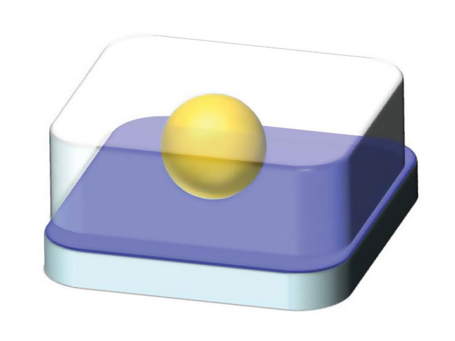 Dans leur expérience, les chercheurs ont juxtaposé une plaque de silice (bleu), un liquide de bromobenzene (transparent) et une bille d'or (jaune). Ils ont alors observé que dans de telles conditions, l'or et la silice se repoussaient.