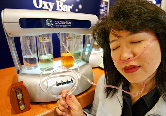 A Tokyo, employées de bureau et hommes d’affaires peuvent s’offrir, à l’heure du sandwich, un petit bol d’oxygène à 520 yens les dix minutes (un peu plus de 4 euros). Des bornes d’oxygène aromatisé aux fruits ou aux herbes, au choix, sont en effet installés dans les grands magasins à la disposition des clients « en manque ».