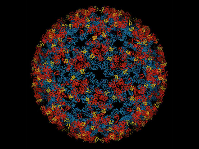 Grâce à la lumière très spécifique produite par le synchrotron Soleil, l’accélérateur de particules situé en Île-de-France, une équipe française a pu visualiser l’architecture tridimensionnelle de l’enveloppe du virus du chikungunya et établir, pour la première fois, le rôle et l’origine de chacune de ses protéines de surface : la protéine E1 (ici en bleue) et la protéine E2 (ici en rouge et jaune). Source : Nature, 2010, 468(7324): 709–712 (2 décembre 2010)