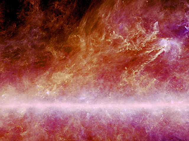 Représentant une portion de ciel d’environ 50 degrés et révélant l’état de la poussière dans un voisinage d’environ 500 années-lumière du Soleil, cette image composite a été obtenue par le satellite Planck au cours du premier relevé intégral du ciel, commencé en août 2009 et complet à 98% à la mi-mars 2010. Les tons rougeoyants correspondent à des températures qui n’atteignent que 12° au-dessus du zéro absolu (-260° C) alors que les tons plus blancs sont plus chauds (plusieurs dizaines de degrés au-dessus du zéro absolu) et correspondent à des régions où se forment des étoiles massives. Source : Esa, Cnes, 17 mars 2010