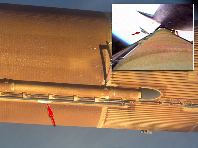 La trace laissée sur le réservoir par le morceau d'isolant (photographiée par l'un des astronautes au moment de la séparation entre la navette et le réservoir externe)En vignette : le morceau de mousse au moment où il s'est détaché du réservoir.