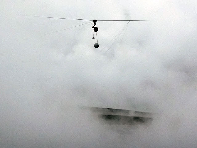 Suspendu au câble, le collier de boules s'apprête à traverser le cratère