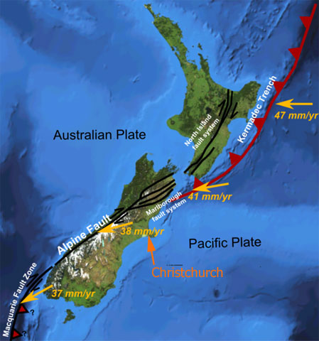 La Nouvelle-Zélande est située à la jonction de deux plaques tectoniques, la plaque Pacifique passant sous la plaque Australienne (en rouge sur la carte). Cette zone de subduction est à l’origine de nombreuses failles qui parcourent le territoire néo-zélandais dont les principales figurent en noir sur la carte.