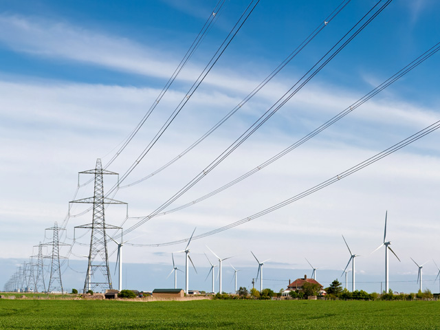 Lignes à haute tension sur fond d'éoliennes