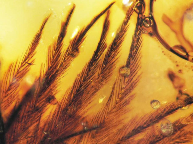 Onze spécimens de plumes de dinosaures et d’oiseaux datant de la fin du Crétacé (de 70 à 85 millions d’années) ont été découverts dans de la résine d’arbre fossilisée provenant d’un gisement d’ambre canadien. Certaines plumes (les plus vieilles) ont une structure de filaments et ressemblent à celles des dinosaures non volants, d’autres (les plus jeunes) témoignent d’une grande sophistication par leurs couleurs et par leur adaptation au vol et au plongeon. Les paléontologues en concluent que les plumes ont continué à évoluer vers leur forme moderne avant l’extinction des dinosaures.