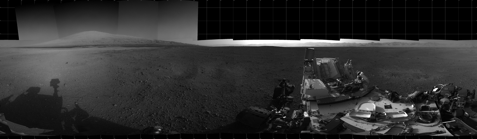 Ce panorama de Mars a été reconstitué à partir des données recueillies par le rover Curiosity. Sur la gauche, le mont Sharp, encore appelé Aeolus Mons, atteint 5,5 km d’altitude. Il s’agit de la plus haute montagne visible du rover. L' étendue noire, au pied de Sharp, constitue un ensemble de dunes de sables à travers lesquelles Curiosity devra se frayer un chemin. Après quoi, le robot entamera l'ascension de la montagne où il analysera la roche, à la recherche de traces de molécules organiques indispensables à la formation de la vie.