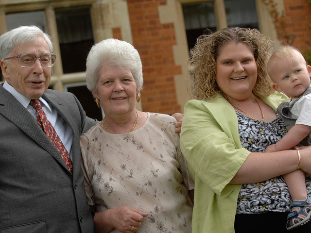 Le physiologiste britannique Robert G. Edwards (85 ans) vient d’être récompensé pour ses travaux sur la fécondation in vitro qui ont rendu possible le traitement de l’infertilité de nombreux couples. C’est avec l’aide de Patrick Steptoe, gynécologue mort en 1988, qu’il passe de l’expérimentation animale à la fécondation in vitro chez l’homme. Après sept années de tentatives infructueuses, le succès arrive avec la naissance de Louise Brown, le 25 juillet 1978. C'est le premier bébé-éprouvette au monde. On la voit ici à l’occasion de son trentième anniversaire, portant son fils dans les bras (conçu de manière traditionnelle), aux côtés de sa mère et du docteur Robert G. Edwards.