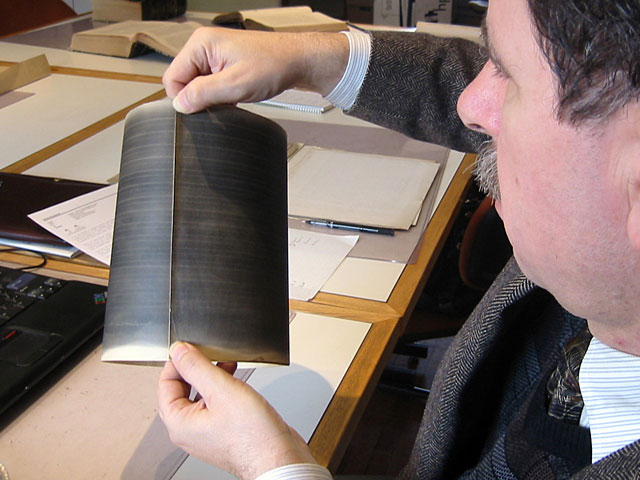 David Giovannoni examine un phonautogramme de 1860 dans les archives de l'Académie des Sciences, à Paris.
