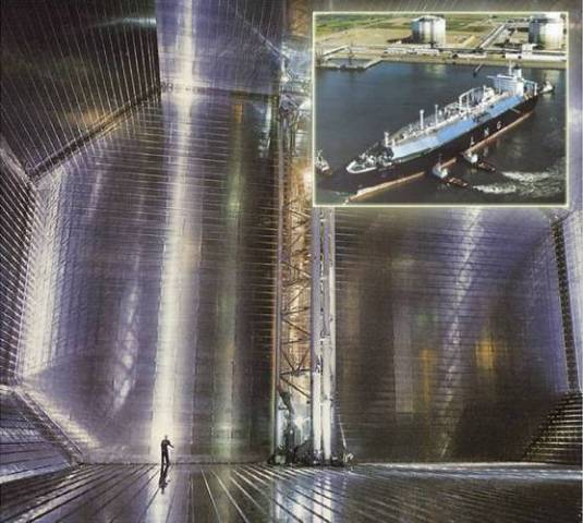Cuve en Invar d'un méthanier Un méthanier est un navire servant à transporter du gaz naturel liquéfié dans ses citernes. L’Invar est un alliage de fer et de nickel qui a la particularité de présenter un coefficient de dilatation thermique dix fois plus faible que celui des aciers. Le personnage, visible en bas à gauche de l'image, donne l'échelle.