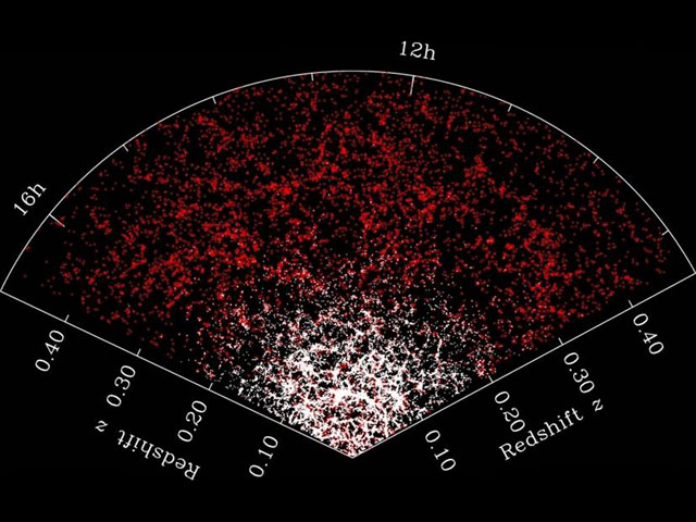 Cette carte partielle montre la distribution de quelque 70 000 galaxies jusqu’à une distance de 7 milliards d’années-lumière. La répartition et la vitesse des galaxies observées aujourd’hui constituent la preuve que la théorie de la relativité générale d’Einstein fonctionne réellement à très grande échelle. Ainsi viennent de le démontrer des astrophysiciens américains et suisses. Source : Nature, 11 mars 2010