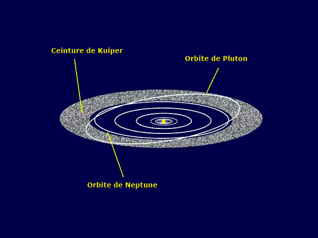 Située à une distance comprise entre 30 et 50 UA du Soleil, la ceinture de Kuiper abrite des objets de diamètres variables, allant de quelques kilomètres à 3000 km (pour 2003 UB313). La plupart des objets découverts à ce jour (plus de 1000) sont sphériques et sont constitués de roches et de glaces (d’eau et de méthane). La ceinture de Kuiper est vraisemblablement un réservoir de comètes dites « à courte période » (comètes dont la période de révolution autour du Soleil est de quelques dizaines, voire quelques centaines d’années).