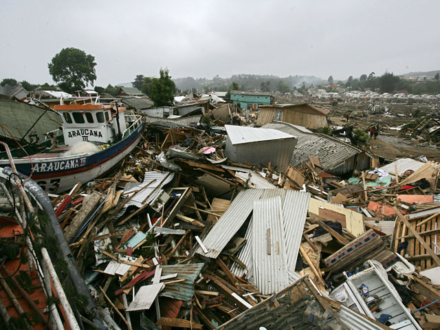 Le 27 février, un séisme de 8,8 sur l'échelle de Richter survient au Chili, suivi d'une vingtaine de répliques de magnitude supérieure à 5 et de quatre supérieures à 6. L'épicentre se situe en mer, au large de la ville de Concepción. Sur 200 km de côte dans la province du Maule, un raz-de-marée submerge des villes comme ici Dichato (photo) et villages jusqu'à 2 km à l'intérieur des terres. Au 9 mars, le bilan est de 497 morts.