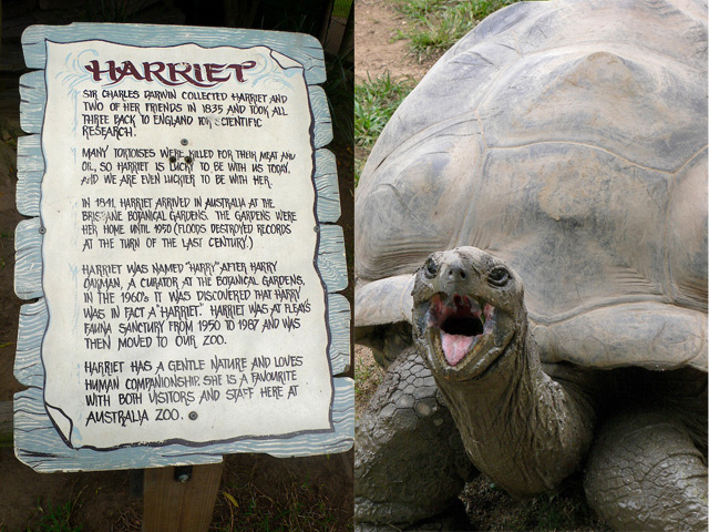 Harriet, tortue géante des Galápagos (Geochelone nigra), aurait quitté son île natale à l'âge de 5 ou 6 ans, dans les bagages de Darwin à bord du fameux HMS Beagle en 1835. Elle vient de s'éteindre à l'Australia Zoo après un siècle passé aux antipodes.