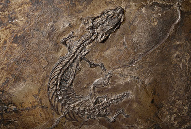 Vieux de 47 millions d’années, ce petit fossile (7 cm) découvert en Allemagne se révèle être l’ancêtre commun des amphisbènes (reptiles fouisseurs sans pattes ressemblant à des vers de terre) et des lézards, iguanes et autres serpents. En effet, l’examen aux rayons X de ce lézard fossile, nommé Cryptolacerta hassiaca, montre qu’il combine à la fois les caractéristiques des lacertidés (sauriens dont font partie les lézards) et des amphisbènes.