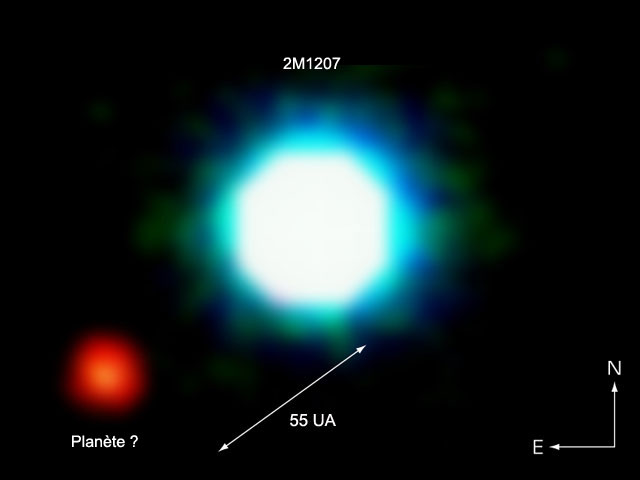 Au centre de l'image, la naine brune 2M1207, dans la constellation de l'Hydre. Le point rouge situé tout près pourrait être une exoplanète.
