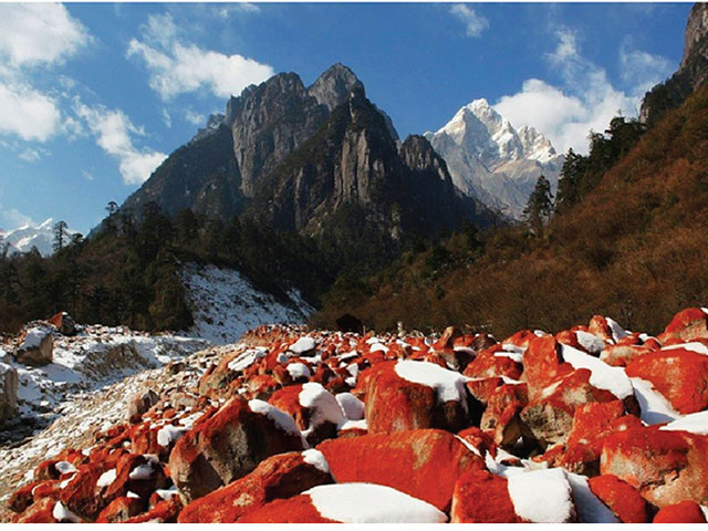 Une nouvelle variété d'algue baptisée trentepohlia jolithus yajiagengensis vient d'être caractérisée. De couleur rouge, elle appartient pourtant à la famille des algues vertes et tapisse les roches autour de la rivière Yajiageng, en Chine. C'est le glacier du Mont Gongga qui, en été, fournit l'air humide nécessaire à son développement. Plus généralement, l'activité humaine et le réchauffement climatique seraient les responsables de l'expansion de cette algue.