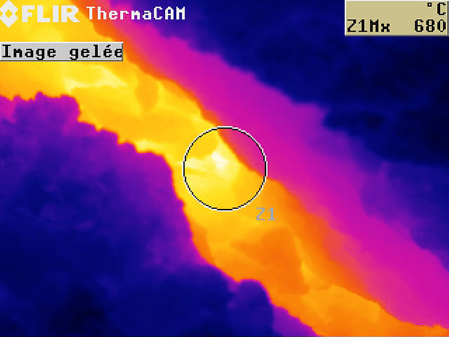 Ne pouvant approcher trop près de la lave d'un volcan, ni y plonger une sonde, des chercheurs de l'Observatoire volcanologique du Piton de la Fournaise (île de la Réunion) ont imaginé un système de mesure par caméra infrarouge. Ils peuvent ainsi cartographier la température d'une coulée de lave et suivre son évolution : le 20 avril 2007, pendant l'éruption, elle était de l'ordre de 1 000°C ; un an après, la température atteint 680°C à 2 m de profondeur et 770°C dans un puits profond de 15 m. Source : Thomas Staudacher / IGPN-Insu / CNRS