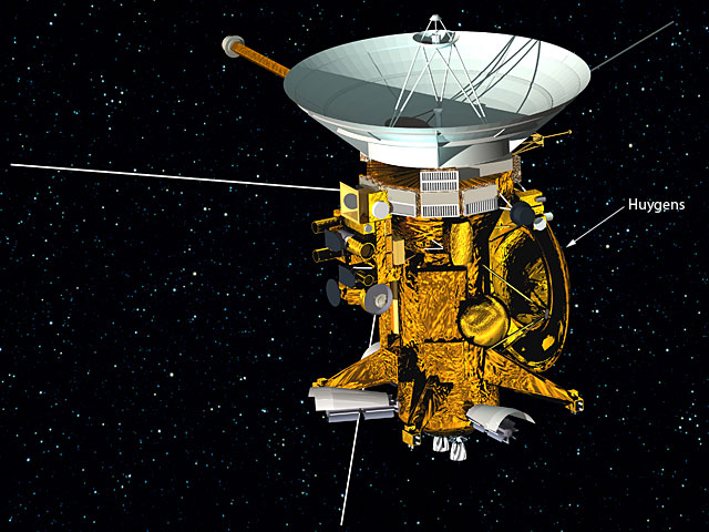 Le module Cassini embarque 12 instruments. L'atterrisseur européen Huygens (situé sous le bouclier de protection à droite) en compte 6.