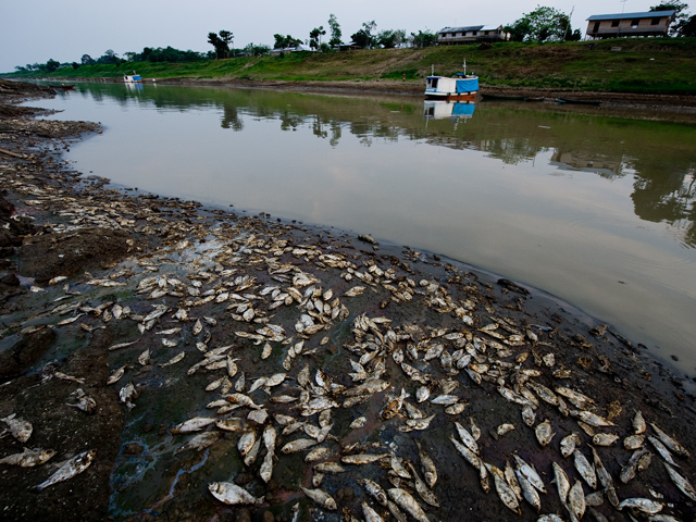 Des tonnes de poissons morts jonchent les berges des rivières qui descendent des Andes en raison de leur très faible niveau d'eau (ici, le fleuve Solimões, à 120 km en amont de Manaus). Cette année, après avoir occasionné des inondations pendant la saison des pluies, le phénomène climatique El Niño provoque actuellement une sécheresse de grande ampleur dans toute l'Amérique latine, du Guatemala à l'Argentine.