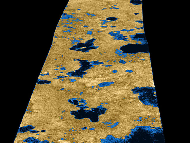 Selon une étude parue le 3 janvier dans la revue Nature, le pôle nord de Titan – le plus gros satellite de Saturne – est parsemé de lacs de méthane comme en témoigne cette image radar réalisée par la sonde Cassini. D’après les chercheurs, le méthane sur Titan décrit un cycle hydrologique actif comparable à celui de l’eau sur la Terre,