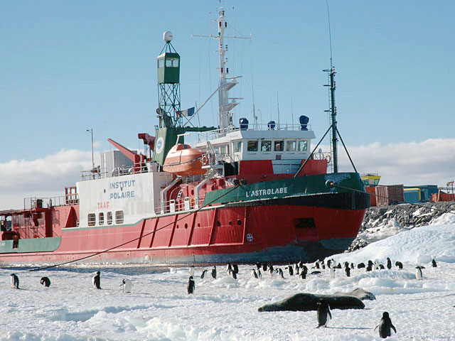 L'Astrolabe à quai sur la base de Dumont d'Urville (Terre Adélie)