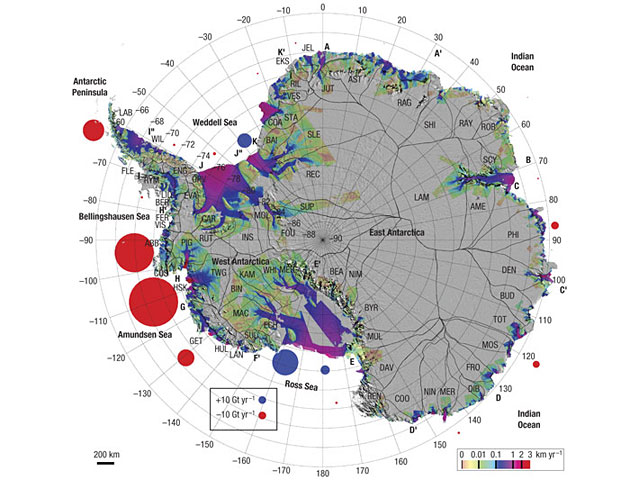 En dix ans, la fonte des glaces du pôle Sud s'est accélérée de 75%, selon une étude publiée dans la revue Nature Geoscience. Concentrée sur l'ouest du continent, en aval des glaciers, et sur la péninsule antarctique, la fonte atteint quelque 192 milliards de mètres cubes, alors qu'à l'est la calotte glaciaire reste stable. (En rouge : la perte de masse ; en bleu, le gain. Les chiffres sont exprimés en gigatonnes par an.)