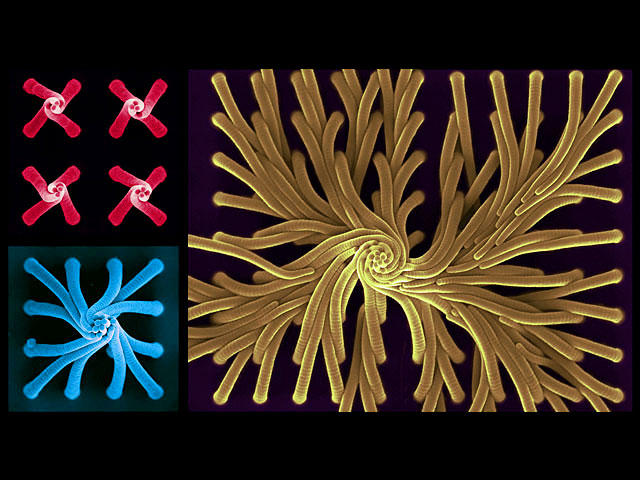 Ces torsades symétriques se sont formées automatiquement à l’évaporation du liquide dans lequel baignaient des nanofibres synthétiques. L'expérience menée par des chercheurs de l'université de Harvard montre aussi que pour changer le « serrage » ou le « tressage » de ces torsades, il suffit de changer la direction d'évaporation du liquide et la rigidité des brins. Ces fibres peuvent également s'enrouler autour d'une sphère et l'agripper. Mais un changement d'environnement (de pH par exemple) peut suffire à faire relâcher l'objet. Ce qui permet un contrôle aisé, à l'échelle du micron, du système de prise ou de lâcher, selon les besoins. Source : Science, 09 janvier 2009