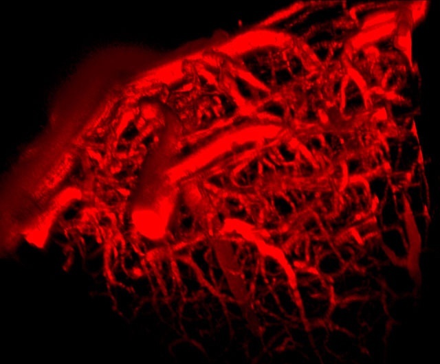 Un nouveau colorant élaboré par des équipes du CNRS a permis d’obtenir cette image en 3D du système vasculaire du cerveau d’une souris. Luminescent dans l’infrarouge, ce colorant destiné à être utilisé en imagerie médicale permet d’atteindre une résolution de l’ordre du micromètre. Une fois injecté dans les vaisseaux sanguins, il est facilement éliminé par les reins et aucun résidu toxique n’a été relevé dans le foie.