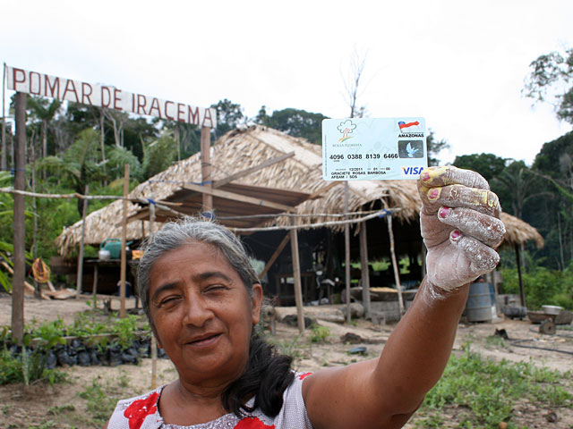 Une femme Saracá brandit sa carte de membre du projet Bolsa Florestal.