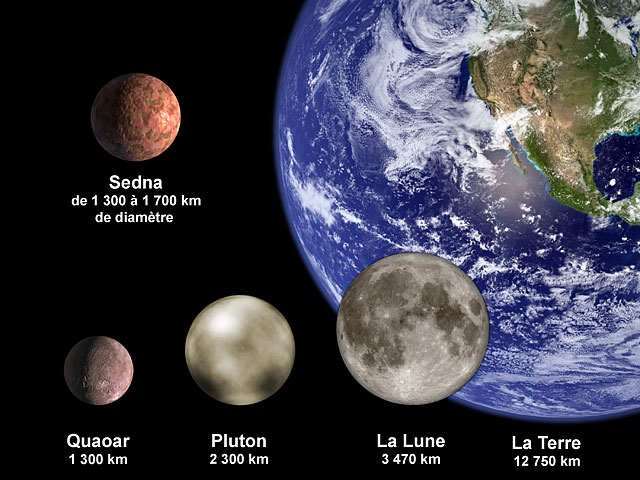 Sedna, comparée à la Terre, la Lune, Pluton et Quaoar (un objet découvert en 2002).