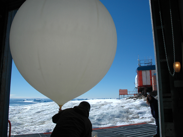 Dans le ciel glacé de la Terre Adélie, un ballon météo s’élève. Il tire une petite boîte noire bardée d’instruments de mesure.