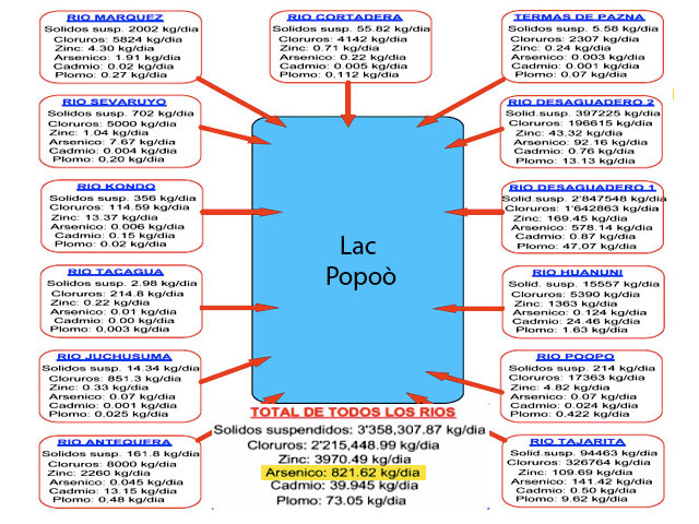 Des mesures réalisées par l'université technique d'Oruro ont permis d'évaluer la quantité de métaux lourds (chlore, arsenic, zinc, plomb, cadmium) apportée tous les jours par chacun des Ríos qui se jettent dans le lac Popoò. On voit ici par exemple que plus de 800 kg d'arsenic s'y déversent ! Ces métaux lourds ont deux origines, dont il est difficile de déterminer la part respective : l'activité minière et la richesse métallifère de la région.« Evaluación ambiental del lago Poopó y sus ríos tributarios, Universidad tecnica de Oruro y UMSA (laboratorio de Limnología) », G. Zamorra coord.