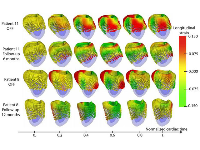 Une équipe de chercheurs de l’université Pompeu Fabra (Barcelone) a développé un nouvel algorithme appelé Temporal Diffeomorphic Free Form Deformation (TDFFD) qui, à l’aide d’images 4D (volume et mouvements en temps réel) permet de réaliser des cartes de la déformation du cœur de personnes souffrant d’insuffisance cardiaque. En testant leur technique sur 21 patients, ils ont réussi à personnaliser les traitements de resynchronisation cardiaque (TRC) selon les caractéristiques réelles de chaque patient. (Patient n°11, avant et après 6 mois de suivi ; patient n°8, avant et après 12 mois de suivi.)