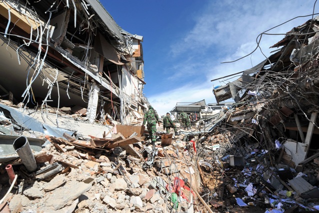 2 octobre : des soldats indonésiens marchent dans les décombres d'un hôtel de Padang (Sumatra). En plein cœur de la ville, de nombreux bâtiments sont effondrés.