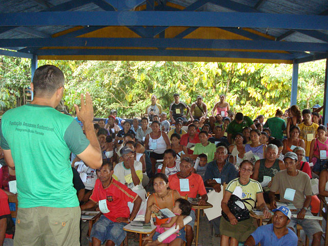 Un représentant du projet Bolsa Florestal explique le fonctionnement de la carte qui permet d'obtenir une bourse de 50 réals par mois en échange de la protection des forêts.