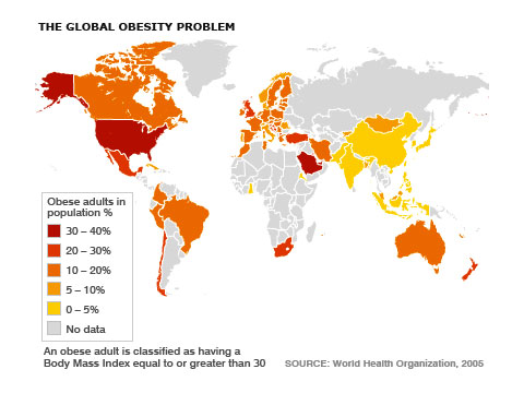 Selon l'Organisation mondiale de la santé (OMS), en 2005 (dernières données disponibles), environ 1,6 milliard d'adultes (âgés de plus de 15 ans) étaient en surpoids et au moins 400 millions étaient obèses. L'OMS prévoit que d'ici à 2015, quelque 2,3 milliards d'adultes seront en surpoids et plus de 700 millions seront obèses.