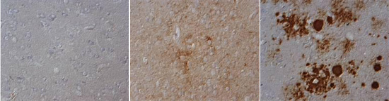 De gauche à droite : cerveau normal, cerveau d’un patient atteint de MCJ, cerveau d’un patient atteint de la nouvelle variante.