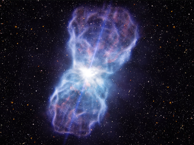 C’est un quasar de dimensions exceptionnelles que le très grand télescope (VLT) de l’Observatoire européen austral (Eso) a permis d’observer : il émet un flux d’énergie au moins cinq fois supérieur à celui du quasar le plus puissant observé à ce jour. Un quasar est un centre galactique très brillant alimenté par un trou noir supermassif. Dans ce cas-ci, une masse approximativement égale à 400 fois la masse du Soleil s'échappe du quasar chaque année, se déplaçant à une vitesse de 8000 kilomètres par seconde.